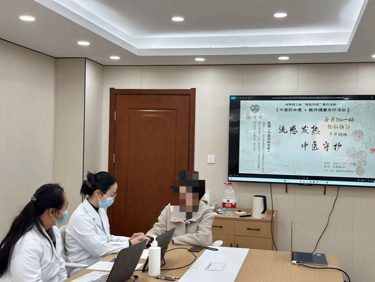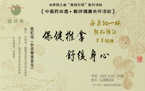 法学院分工会10月27日举行“思政引领”系列活动之中医药非遗·教师健康关怀活动后,得到了学院广大教师对健康管理的高度关注和积极响应。为满足更多老师的需求,11月27日、12月2日,学院分工会再次在东校区弘德楼开展了两次“中医药非遗·教师健康关怀活动”,向学院教师提供上门中医诊疗与针灸推拿服务。