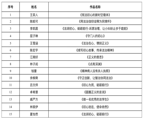 2023年浙江省第十届大学生法律职业能力竞赛演讲类比赛校内选拔赛于2023年3月17日结束。本次比赛共收到参赛作品19件,经学院大学生科技创新活动领导小组采用指导导师回避原则和专家匿名评审方式,拟推荐以下15件作品参加省赛:
