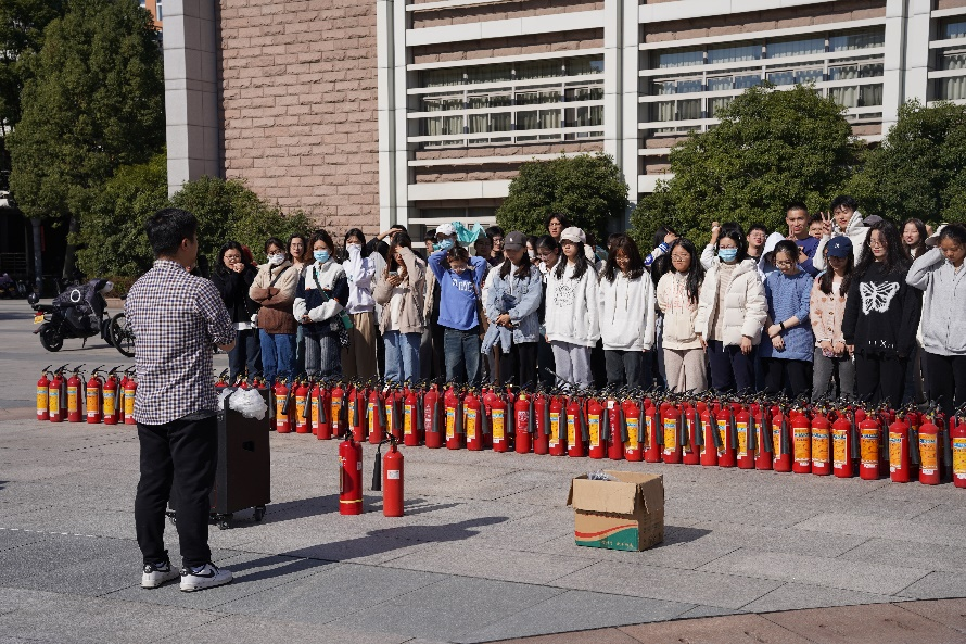 余江老师结合消防安全月主题,详细说明了火灾危害和提前防范的重要性,介绍了学校、寝室常见的消防安全隐患以及安全用电知识。关于消防安全,他向同学们提出四个“要”:要学会检查和排除消防隐患、要学会第一时间扑灭初期火情、要学会组织疏散逃生、要分享传播消防安全知识。随后,他向同学们介绍了干粉和二氧化碳两种灭火器的使用操作办法,并按照“拖、拔、握、按”的步骤进行了灭火现场教学。讲解结束后,同学们纷纷选择了一个灭火器,模拟火灾现场进行了实操演练,整个过程紧张有序,快速高效。