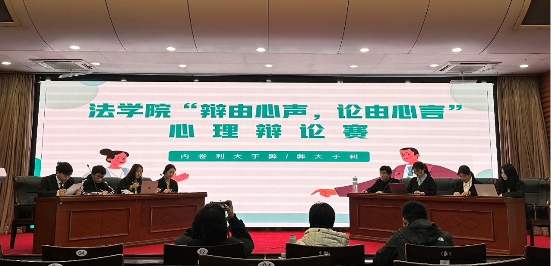 内卷已成为当今一个备受争议的话题。为了激发同学们的思辨精神,增进大家对心理健康问题的探讨,法学院于12月1日在闻厅二楼举办了一场题为“辩由心声,论由心言”的心理健康主题辩论赛。