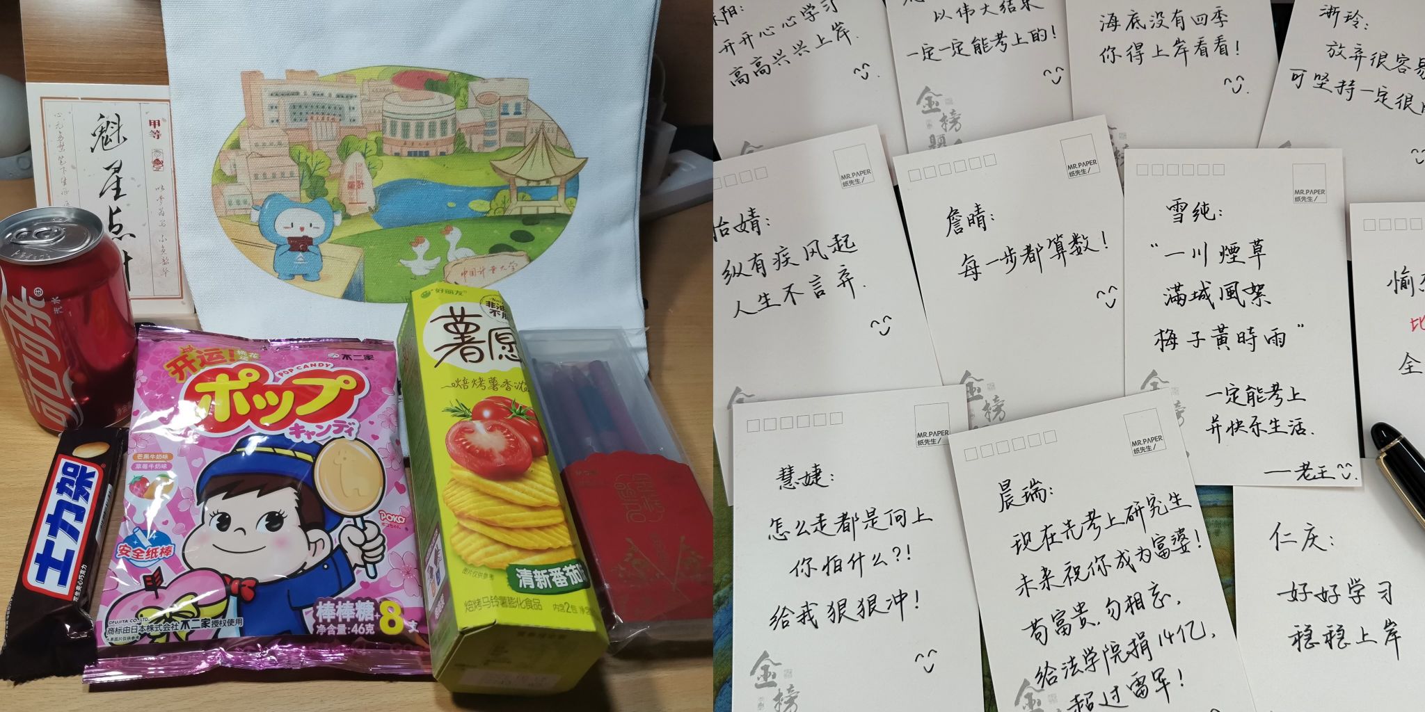 会上,学院领导为每一位考研同学发放了精心准备的慰问礼包,礼包里装有孔庙祈福文具盒、“一定上岸”定制名字可乐、薯愿薯片、士力架以及辅导员为考研学子亲笔书写的考研祝福明信片。一份份带有美好祝福的礼物,预祝同学们士气高昂、如愿以偿、成功上岸、金榜题名。