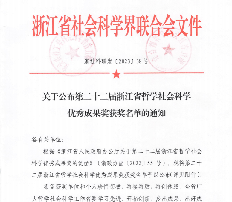 浙江省哲学社会科学优秀成果奖是浙江省哲学社会科学成果最高奖,由浙江省人民政府颁发证书、给予奖励。“十四五”期间,法学院(知识产权学院)已连续两届获得2项省哲学社会科学优秀成果奖二等奖,为推动浙江哲学社会科学事业繁荣发展贡献了具有辨识度的标志性成果,为持续推动“八八战略”走深走实,“勇当先行者、谱写新篇章”提供了强有力的理论支撑与智力支持。