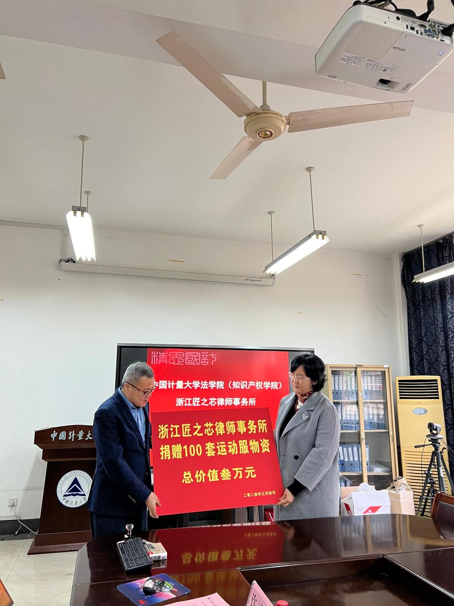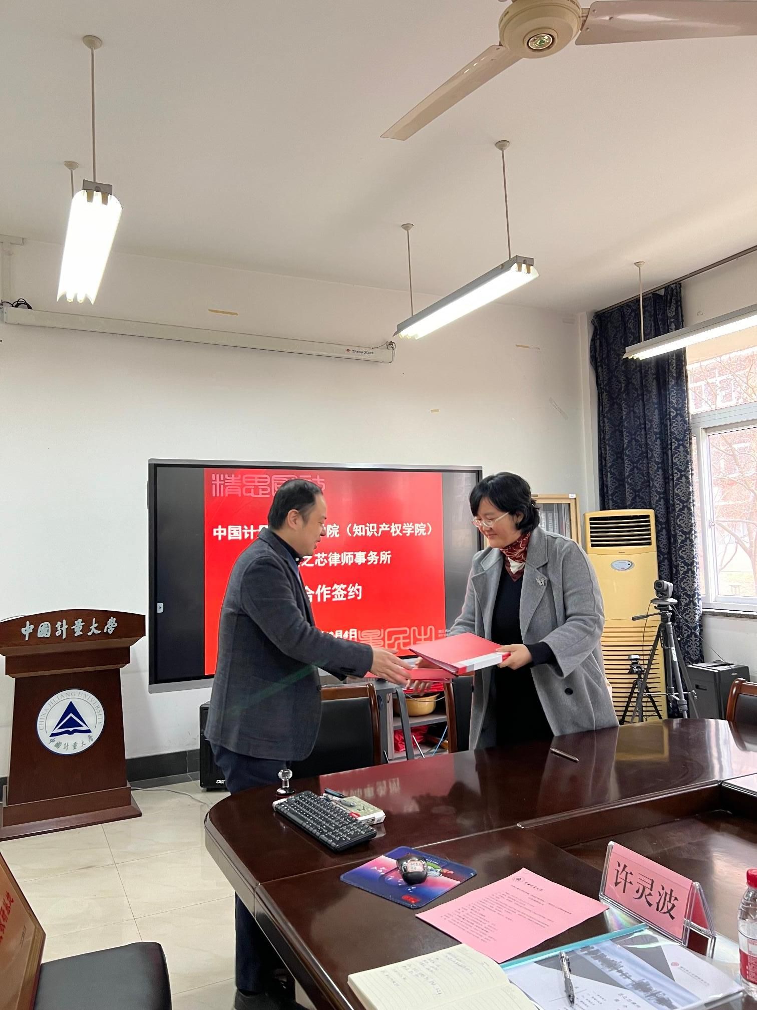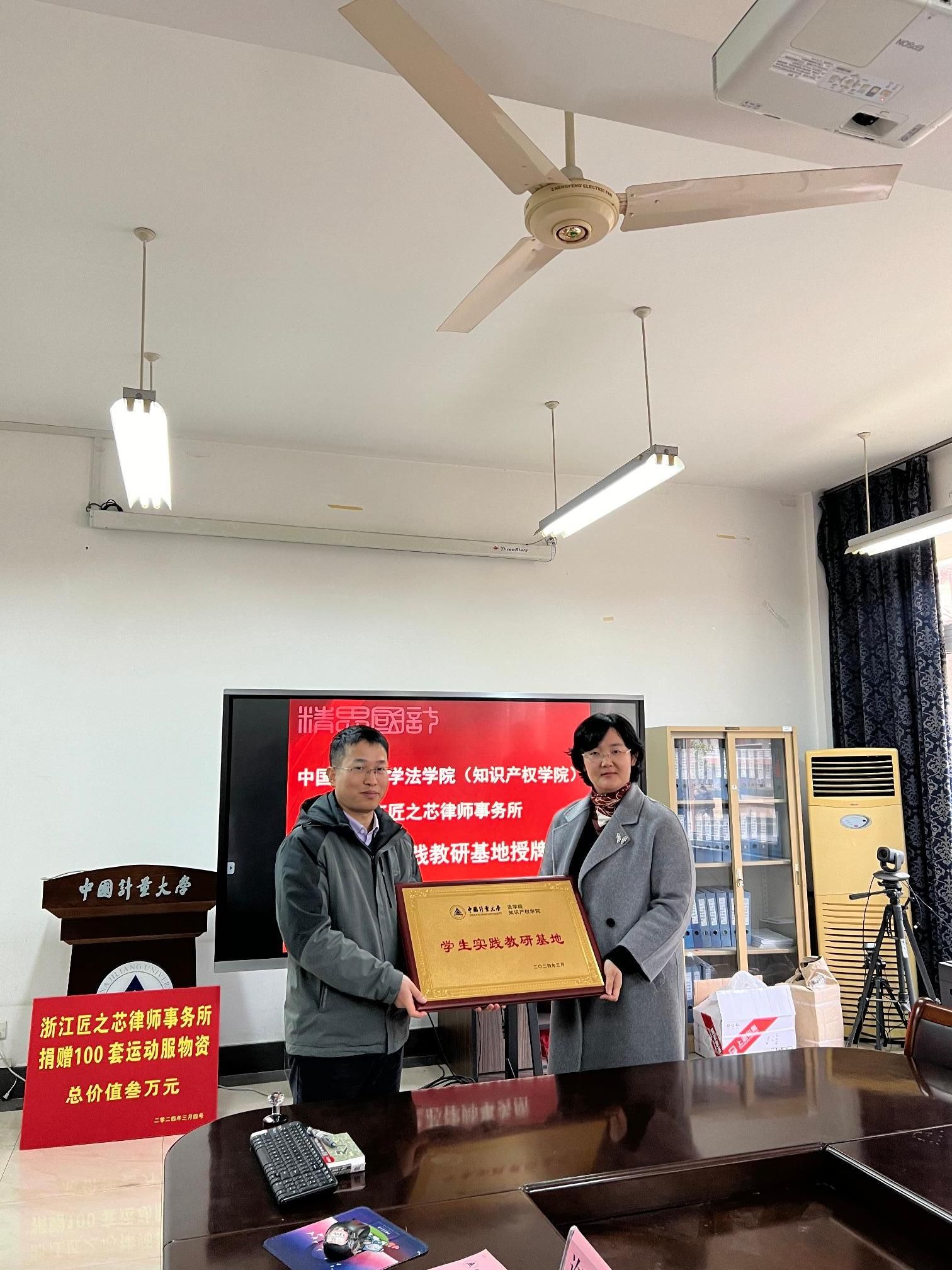会上,徐楠轩和张康康代表双方签署了合作协议,张康康代表匠之芯律师事务所向学院捐赠3万元用于支持学院建设,张徐兴代表学院向匠之芯律师事务所授予“中国计量大学法学院(知识产权学院)学生实践教研基地”铜牌。
