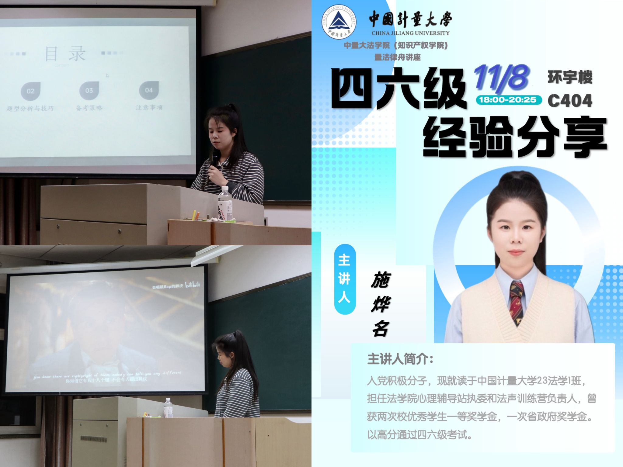 英语四六级考试将近,为缓解大一新生考前焦虑,了解解题技巧、提高备考效率,11月8日,法学院(知识产权学院)党员之家、“倾心法苑”心理健康辅导站联合举办了英语四六级辅导讲座。讲座邀请高分通过英语四六级考试的孙沅姝、彭雪、施烨名3位学姐作为分享嘉宾,大一全体新生参加讲座。