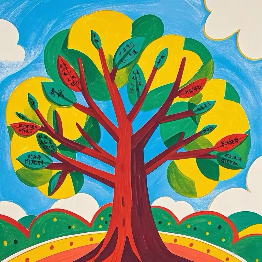 活动伊始,同学们通过观察校园内的树木或者网上搜索自己喜欢树木的模样作为创作模板,用色彩斑斓的画笔写下对自己对未来的期望或者写下当下面临的心理压力,绘制出了一幅幅生动而富有内涵的生命树作品,每一份画作都倾注了创作者真挚的情感与无限的创意,散发着蓬勃的生命气息却又呈现出别具一格的内心世界。作品完成后,同学们可以选择自己收藏,或者粘贴在绘画作品展示板上供同学们欣赏,帮助他人获得灵感和鼓励。最后,将展示板上的所有作品排列在一起,构成一片绚丽多彩的“心灵森林”,同学们穿梭在其中,欣赏一幅幅作品,收获满足与心灵的慰藉。