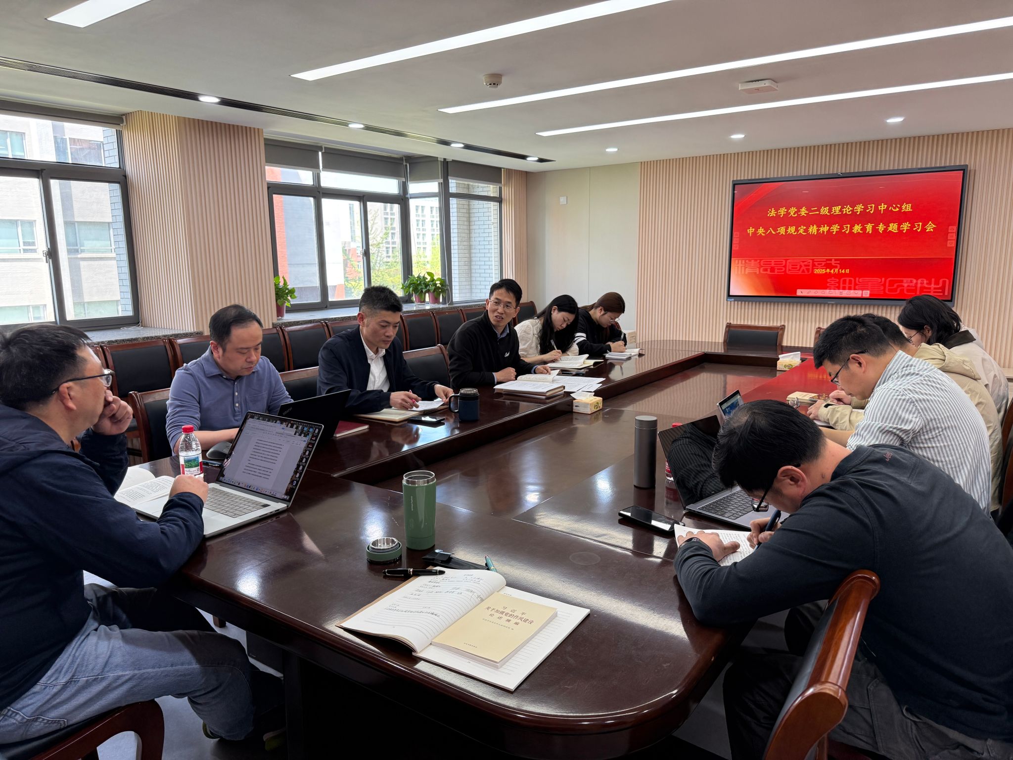 4月14日下午,法学院党委理论学习中心组召开深入贯彻中央八项规定精神学习教育读书会。中心组全体成员、各师生党支部书记参加会议,会议由学院党委书记张徐兴主持。