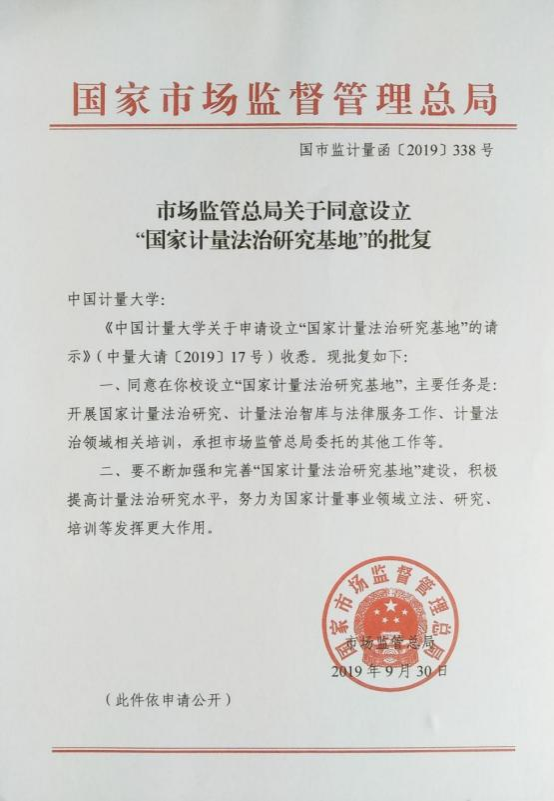 2019年9月30日,市场监管总局批准在中国计量大学设立“国家计量法治研究基地”,进一步推动《计量法》修订工作。