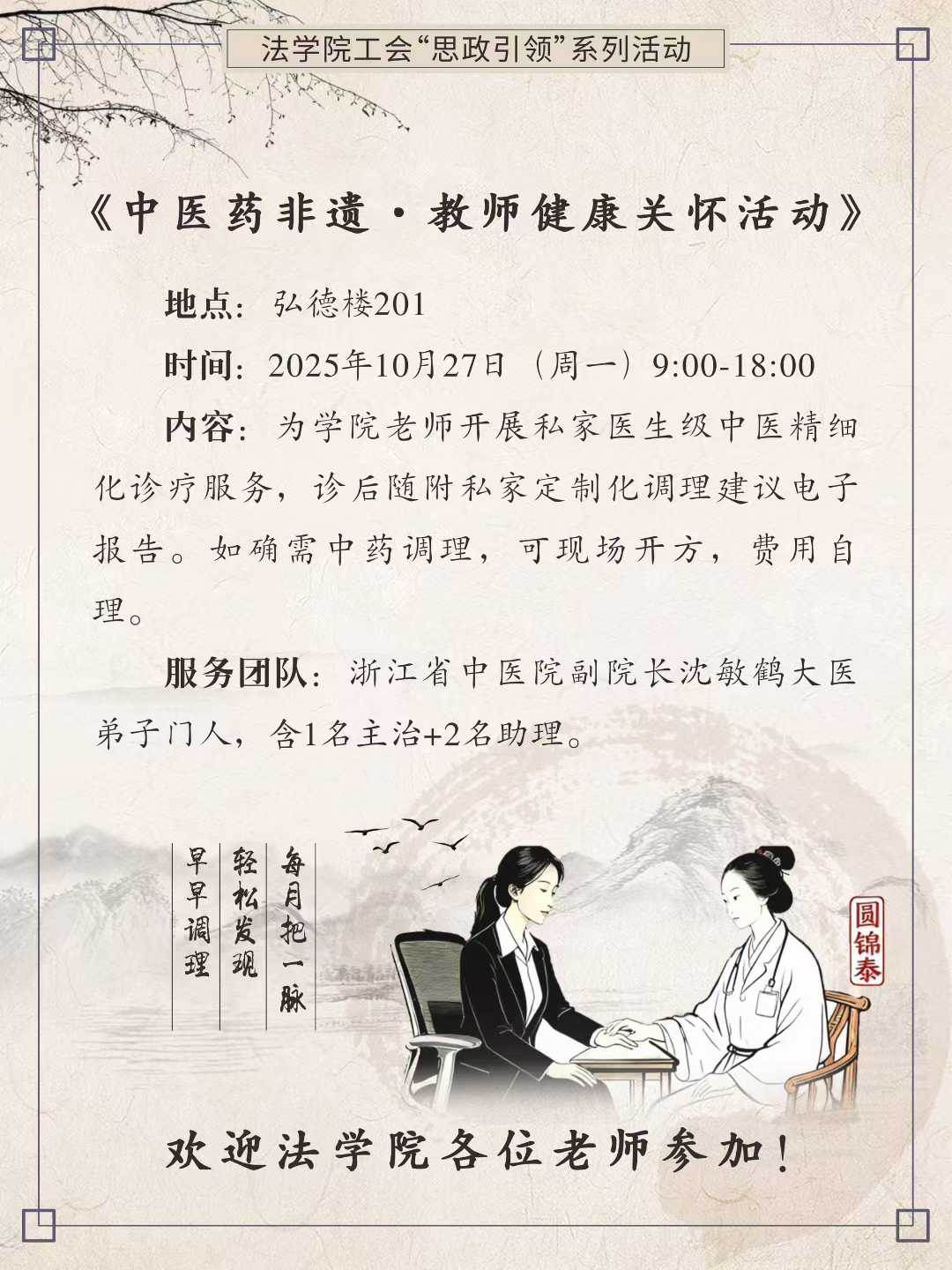 10月27日,法学院分工会在弘德楼201室举行“思政引领”系列活动之中医药非遗·教师健康关怀活动。本次活动邀请到浙江省中医院副院长沈敏鹤大医弟子门人团队为学院教师提供中医精细化诊疗服务,活动开放报名后一小时内24个名额即全部报满,充分展现了教师对健康的高度关注和参与热情。