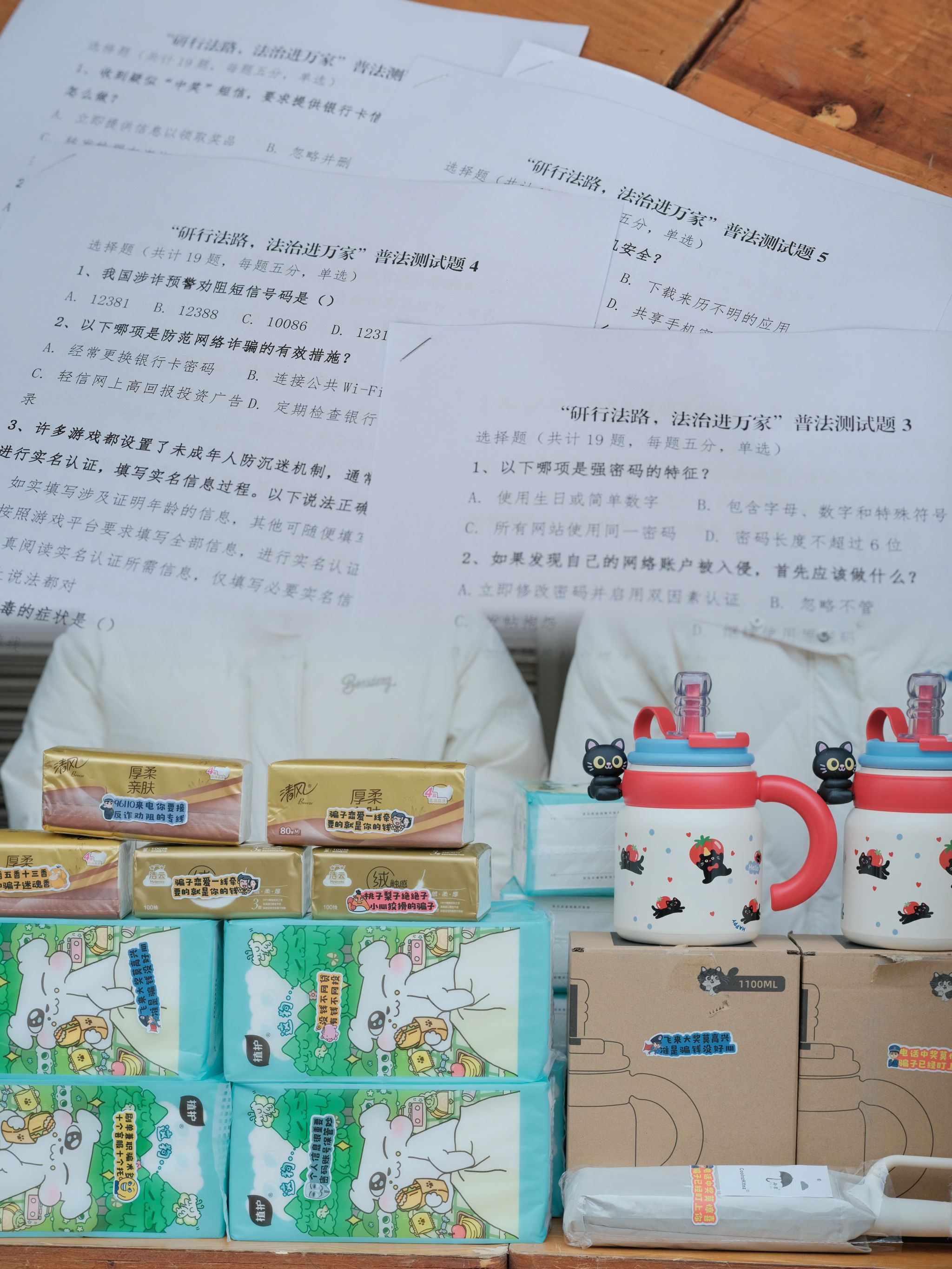 活动现场气氛热烈,吸引了众多居民积极参与。支部成员基于前期调研,聚焦与日常生活紧密相关的五大主题——消费者权益保护、酒驾醉驾危害、个人信息安全、物业管理条例、网络安全与反诈骗,精心设计了内容贴近民生、形式生动易懂的普法知识问卷,完成答题且表现优异的社区居民可获得贴有反诈提示标语的实用日用品作为奖励。这一“法治+实用”的激励方式,既是对居民学习成果的肯定,也使法治宣传更加贴近实际、深入人心。居民们答题热情高涨,或认真研读思考,或邻里交流探讨,或向现场的“学生普法员”咨询。支部成员耐心解答,结合具体案例进行分析,将抽象的法律条文转化为通俗易懂的生活常识,实现了普法教育与社会服务的有机融合。