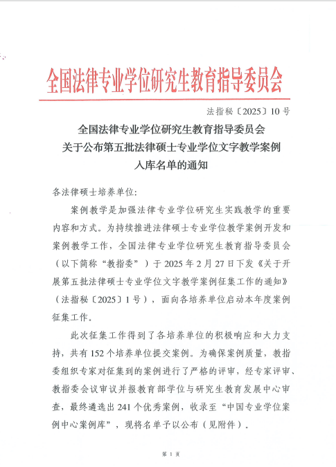 法学院(知识产权学院)申报的教学案例入选第五批法律硕士专业学位文字教学案例库