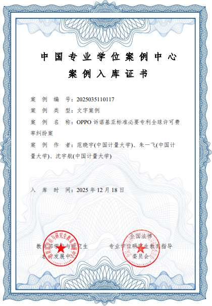 12月22日,全国法律专业学位研究生教育指导委员会(简称“法律教指委”)公布了第五批法律硕士专业学位文字教学案例入库名单,我校法学院(知识产权学院)范晓宇教授、朱一飞教授、研究生沈宇航联合撰写的教学案例《OPPO诉诺基亚标准必要专利全球许可费率纠纷案》成功入选第五批法律硕士专业学位文字教学案例库,并收录至“中国专业学位案例中心案例库”。