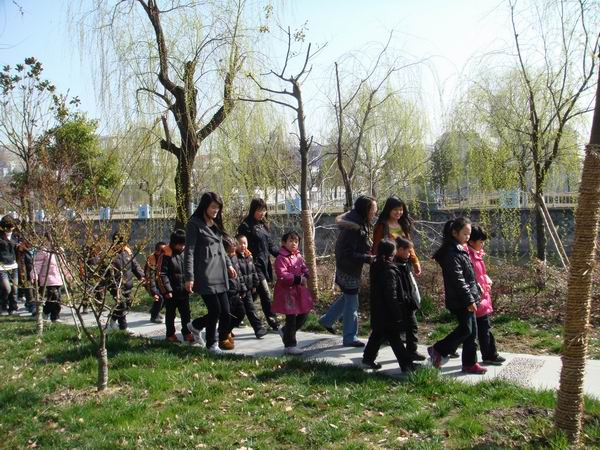 环境保护也要从娃娃抓起,3月16日法学院志愿者带领杭州实验外国语学校学生沿着横穿下沙的河流环保行,以此强化当代小学生的环保意识。
