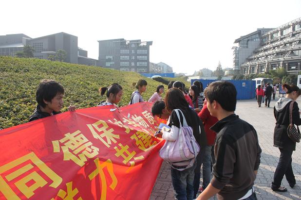 小分队的第一站选择了远近闻名的胡庆余堂。适逢周末,来胡庆余堂寻医问药的市民络绎不绝,小分队成员参观了医药博物馆,充分感受了中医药的魅力。南宋御街上的"吃"也是一大亮点,一些散落民间的南宋美食、南宋小吃聚集在一起,重新焕发生机。江南龙须糖也是非物质文化遗产的活化石,党员之家的同学们观摩了龙须糖的制作过程,制作师傅娴熟的手艺让人赞叹。随后,同学们在吴山广场进行了非物质文化遗产知识介绍和保护签名活动,活动推向了高潮。党员之家拉起了写有"同心同德,保护非物质文化遗产;群策群力,共建杭州城精神家园"的横幅,不少市民停下了脚步驻足观看,很多市民更是热情地留下了自己的签名和祝愿,活动还得到了外国友人的支持,他们与小分队同学们交流了国外对非物质文化遗产的保护工作,并在横幅上签下了自己的名字及国籍,表示了对活动的支持和鼓励。