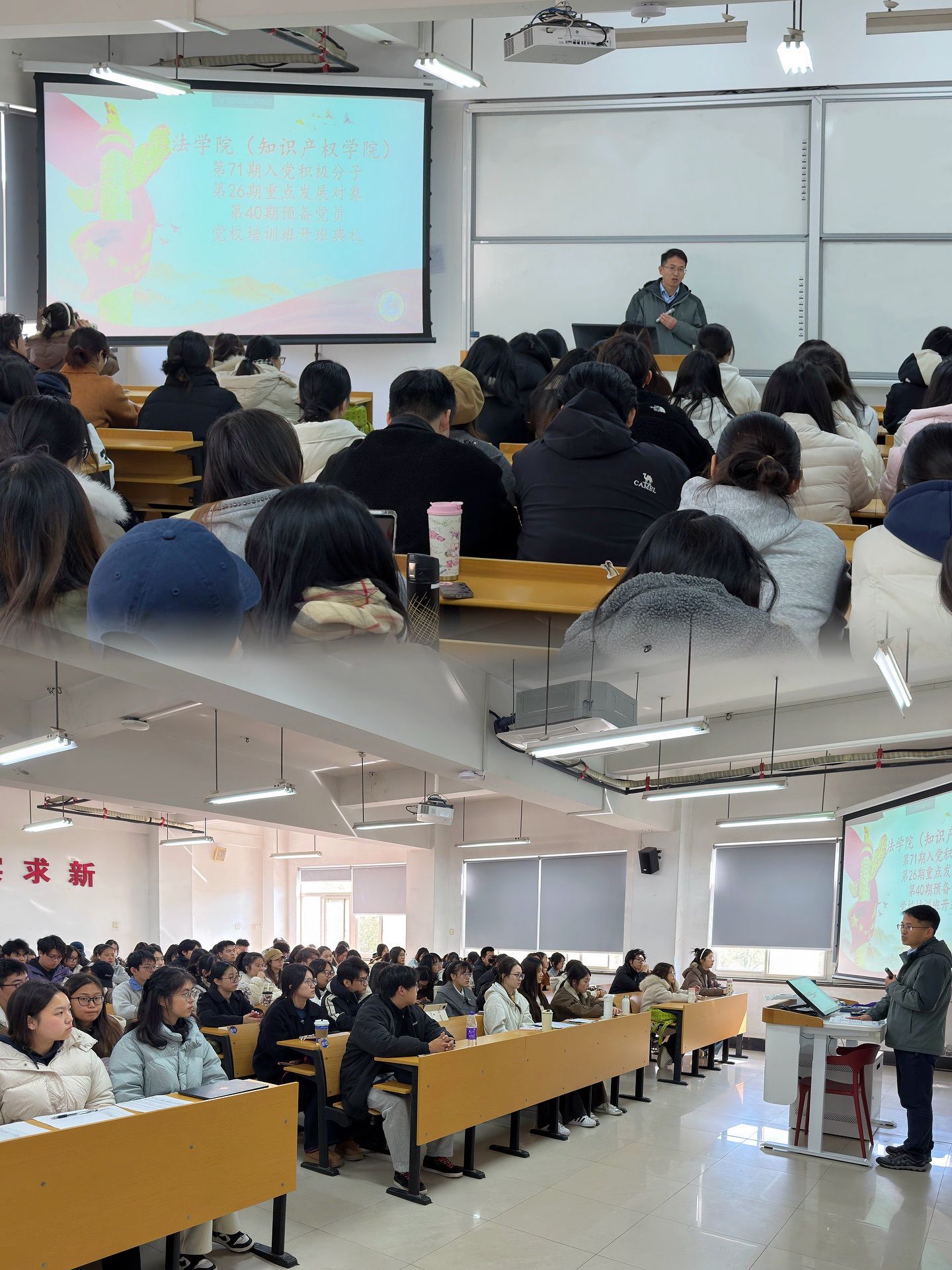 为深入学习贯彻习近平新时代中国特色社会主义思想和党的二十届四中全会精神,切实提高党员发展质量,11月19日中午,法学院党委在环宇楼B201教室举行2025年下半年分党校开班仪式暨党课集中辅导,学院党委书记张徐兴为第71期入党积极分子、第26期重点发展对象及第40期预备党员讲授党课,开班仪式由兼职组织员王玉洁主持。