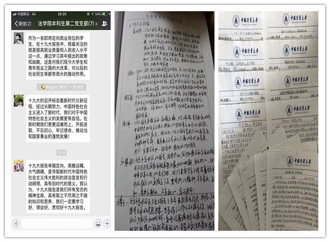 十九大召开期间,法学院各学生党支部分别在格致南楼、环宇楼开展党的十九大精神学习,党员之间进行学习心得的分享与交流,本科生、研究生学生骨干纷纷开展集中学习或自学,写学习笔记或心得体会。 法学院专升本第二党支部组织党员观看党的十九大开幕会视频选段,认真学习十九大报告,对习近平总书记重要讲话重点进行记录。观看视频结束后,党员们进行学习心得的分享与交流,大家踊跃发言、积极讨论。党支部副书记陈佳琪首先提到感触最深的是,报告有三段提及两岸关系,其中重提“六个任何”,即绝不允许任何人、任何组织、任何政党、在任何时候、以任何形式、把任何一块中国领土从中国分裂出去。正在准备考研的叶星月说,政治考试的考点定会围绕十九大,如中国特色社会主义进入新时代,我国社会主要矛盾已经转化为人民日益增长的美好生活需要和不平衡不充分的发展之间的矛盾。党员倪陈斌说“对于法学院的学生来说,十九大报告中提及的坚持全面依法治国,依法治国、依法行政、依法执政共同推进,深化司法体制的改革和提高民族法治素养等,将法律上升到一个更加重要的层面。作为法律学习者,应该更加明确这个时代所赋予我们的重要使命,只有加强自身法律专业知识的业务学习,才有可能熟练运用专业法律知识,为完善社会司法体系以及为法律的推广普及献一份力”。党支部委员蓝张依说“在十九大报告的最后,习近平总书记将一段重要的话送给我们青年,代表对青年的期待和希冀,我想再次和大家一起分享。‘青年兴则国兴,青年强则国强。青年一代有理想、有本领、有担当,国家就有前途,人民就有希望。’‘中华民族伟大复兴的中国梦终将在一代代青年的接力奋斗中变成现实。’等表明时代所寄予我们年轻人的厚望。我们自身要不负时代寄予我们年轻人的伟大使命,努力成为一个有专业知识能力、有抱负理想和有责任担当的年轻人。脚踏实地,怀抱理想,遇到艰难挫折,提醒自己不忘初心,砥砺前行”。 本科生、研究生学生骨干充分利用课余时间,通过读报纸、看新闻等形式学习十九大,均表示内心激动,热血沸腾,并形成“焕发精气神,开创新业绩”,“五年砥砺奋进,共话责任担当——喜迎党的十九大”,“十九大的‘健康’焦点”,“绘就伟大梦想新蓝图,开启伟大事业新时代”,“奋进新时代,开启新征程”,“十九大报告,习近平直抵人心的19句话”,“新时代中国特色社会主义思想和基本方略”等学习笔记或心得体会。 法学院开展此次学习交流分享会,旨在更加坚定学生信念,跟着党坚持中国道路、弘扬中国精神、凝聚中国力量,并让学生党员、学生骨干增强思想政治教育,加强党的知识普及。 ![]() 学生党支部学习 ![]() 学生骨干学习 |