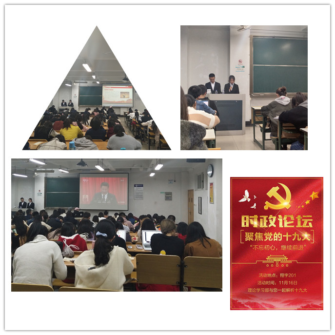| 11月16日晚,法学院党员之家在翔宇楼201教室举办“聚焦党的十九大”主题时政论坛,法学院大一、大二、大三学生参加本期时政论坛。 为举办本期时政论坛,法学院党员之家理论学习部在十九大之前,开始策划活动,收集党的十九大资料;在十九大期间,搜集时事新闻、热门话题,收藏时事评论、要点解读;在十九大之后,下载十九大视频资料,剪辑文字与音频,制作主题PPT。 在时政论坛现场,两名主持人根据PPT内容,分为五个部分对十九大精神进行深入解析,并形成交流和分享。如,砥砺奋进的五年;不忘初心,继续前行;精准扶贫,攻坚克难,践行庄严承诺;保障和改善民生,没有终点站;做合格党员,永远跟党走。同学们通过参加本期时政论坛,掀起学习贯彻十九大的热潮,深入了解十九大所传递的精神,为树立远大理想,为实现人生价值打下坚实的基础,并纷纷畅谈自己的感受。