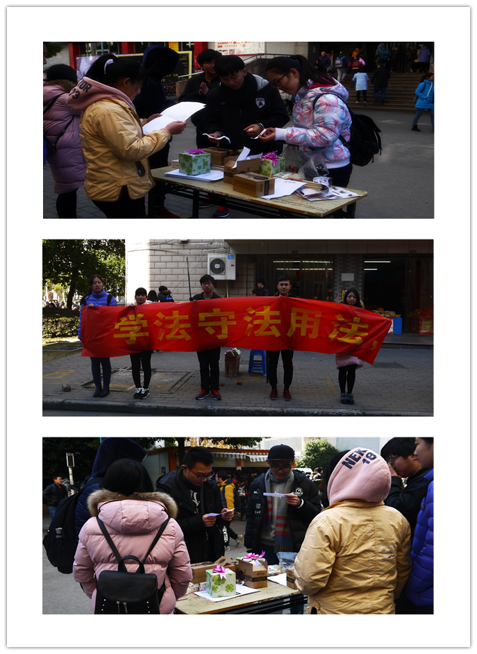 12月17日,法学院党员之家志愿者服务队在生活区G3餐厅门口开展普法宣传活动,主题是面对当代青少年的法律问题,宣传法制知识,让青少年对犯罪有所了解,从而减少犯罪的发生,同时促进普法活动的开展,宣传并弘扬法律精神。