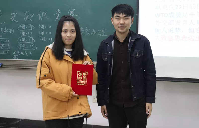 此次活动分为三轮,分别为小组晋级赛、个人淘汰赛和冠军争夺赛。来自2017、2018级的28名同学通过抽签随机组成7支小队,第一轮为选择必答题和判断必答题,最后决出3支小队共12名同学晋级。第二轮为个人淘汰赛,采取车轮战的方式进行风险答题,决出4名同学晋级。第三轮冠军争夺赛,不仅考验选手的党史知识积累的同时,也是政治素养的全面考察,问题涉及党史、党章、十九大、习近平新时代中国特色社会主义思想以及台湾“九合一”选举、中国关于世贸组织改革的立场等近期时政热点分析。最终,来自2018级的林玲、沈薇、任颖3名同学分别获得比赛冠亚季军。