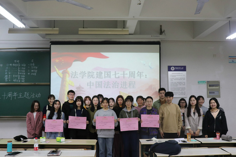 为庆祝新中国成立70周年和五四运动一百周年,回顾新中国成立以来中国法制建设,激发广大青年党员奋进法治新时代,4月26日晚,法学院党委主办,院党员之家承办的新中国成立70周年系列活动——新中国成立以来中国法治进程知识竞赛暨主题党日活动在翔宇楼306教室举行,法学院兼职组织员李晨、各党支部代表和党员之家全体成员参加。
