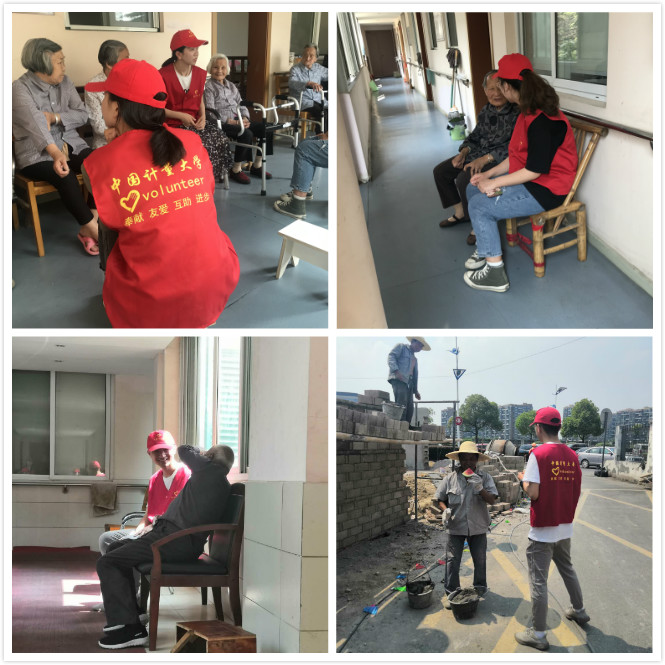 经过与敬老院主管人员的事先沟通,志愿者们大致分为与老人沟通组和义务劳动组。分配好志愿工作和相应物资后,志愿者们有条不紊地开始各自的志愿活动。有志愿者看见庭院内胡乱摆放着积满灰尘的共享单车,便动手抬到庭院一角的停车区;有志愿者寻找到竹扫把后,打扫庭院内的枯枝落叶;有志愿者利用旁边工地工人多余的一次性筷子,将草丛树丛里的烟头、糖纸等小垃圾一一拣起。与此同时,沟通组也带着事先买好的时令水果找到正在走廊里晒太阳的几位爷爷奶奶,爷爷奶奶们十分亲切开心,热情地和志愿者们打招呼。交流过程中老人们询问志愿者的学习状况,交流他们平时的生活状态。有志愿者给在晒太阳的老人表演节目,演唱红歌时有老奶奶也热情加入进来,志愿者和老人们其乐融融。