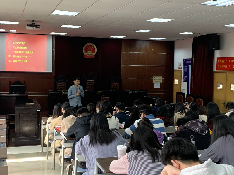为响应学校“廉政文化周”的号召,加强党员廉政教育,提升党性修养,结合近期党支部开展主题教育专题组织生活会、民主评议党员等相关工作安排,11月15日中午,法学院党委在格致南楼124模拟法庭召开学生党员大会,全体学生党员、党建助理和党员之家执委参加。会议由法学院兼职组织员李晨主持。