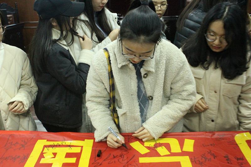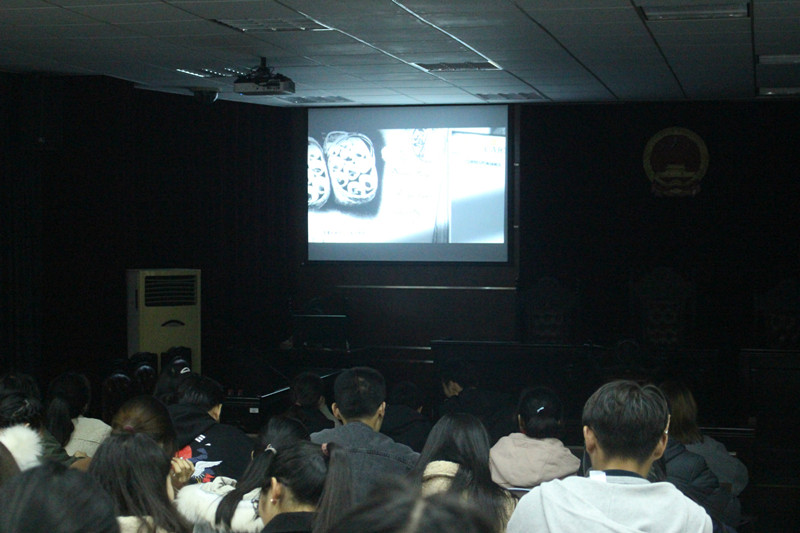 为保证活动顺利进行,志愿者服务队的同学提前到模拟法庭,准备电影播放。主持人作观影引导词:“虎踞龙盘,钟山风雨,南京这座历史文化名城在1937年那个风雨飄摇的年代里留下了多少的伤痛。30万亡灵,30万冤魂,南京啊,它是一座血与肉筑起的城啊!一二一三,我们铭记这一天,八十二周年,筑起记忆之城。让我们跟随影片,走进那个年代,感受那个时代的伤痛,勿忘国殇,知晓今日之责任。”接着灯光逐渐暗下,伴随着影片中的黑白照片,历史由此展开......同学们都认真投入其中,伴随故事的开展,感受发生在那年今日的悲剧。电影播放结束后,由主持人作观影结语:“随着时间的推移,这些历史已被在无形中淡化,甚至发生了刻意的歪曲的现象。我们不能改变也不能忘却这一铁证如山的历史,也不能让他们被淡化被扭曲,我们要让这历史时刻被铭记,才能有我们的民族责任心。”最后,全体在场人员在爱国横幅上签字,将历史铭记在心中,并拍照留念。