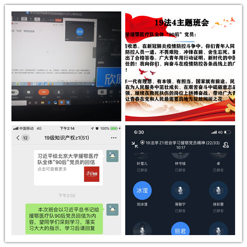 3月24日至29日,法学院2019级各班分别通过网络视频会议、直播主题班会、线上学习会议等多种形式,250余人开展习近平总书记给北京大学援鄂医疗队全体“90后”党员的回信学习。