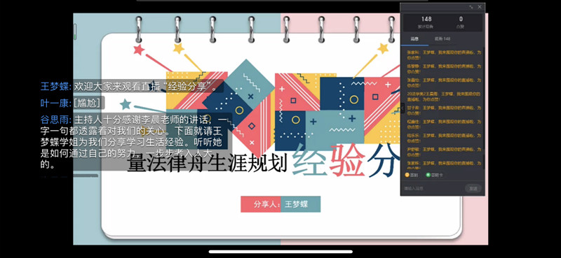 为发挥校友资源优势,帮助在校生做好职业生涯规划,明确目标和方向,以便更好应对考研、就业和出国的选择,法学院推出“量法律舟生涯讲坛”栏目,邀请校友通过钉钉直播进行经验分享。11月5日晚,第一期活动邀请2020届毕业生、中国人民大学在读研究生王梦蝶,作“从专升本到人大研究生”主题分享,300多名学生在线观看。