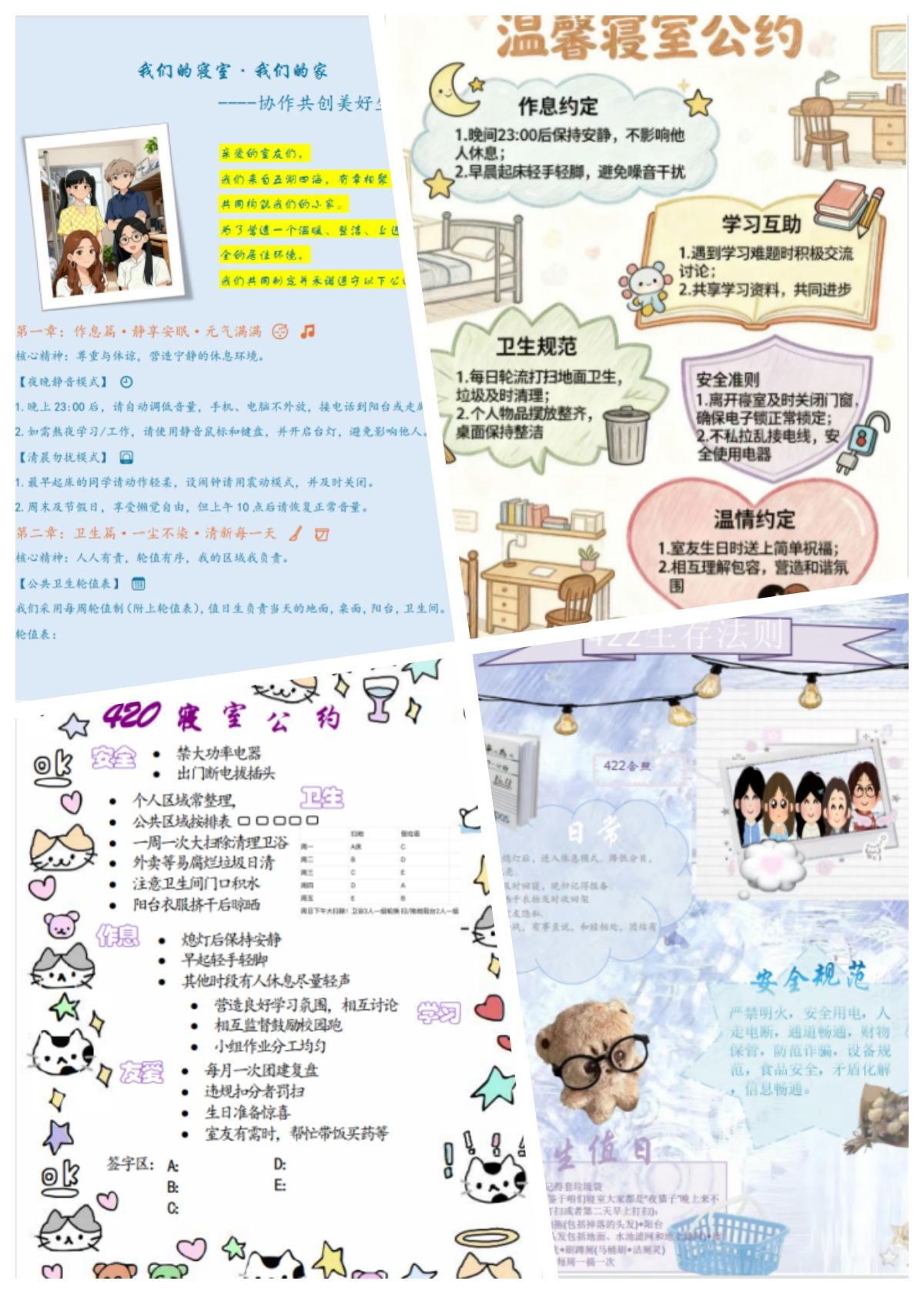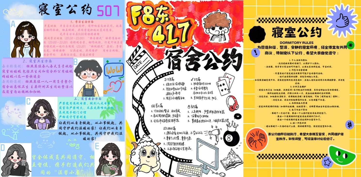 学院通过前期调研明确大赛方向,要求参赛寝室以集体商议为前提,公约应涵盖作息、卫生、安全、学习、沟通五大模块,注重可执行性与共识度,避免形式化。活动通知发布后,2025级新生各班级积极响应,参与对象实现了61个新生寝室全覆盖。同学们积极讨论、商榷、决定寝室公约的具体条款,并赋予公约以个人特色与寝室文化,形式多样,精彩纷呈。有的寝室将公约设计成精美的海报,图文并茂,色彩活泼;有的寝室则灵活运用插图和符号,让规章制度变得亲切易懂;有的寝室将寝室成员合照和制定过程融入公约条款,颇有记忆点。这些充满巧思的作品,不仅是寝室管理的有效工具,更成为了承载室友间深厚情谊的独特文化符号。最后,各寝室成员均在纸质公约上签署名字并完成张贴。