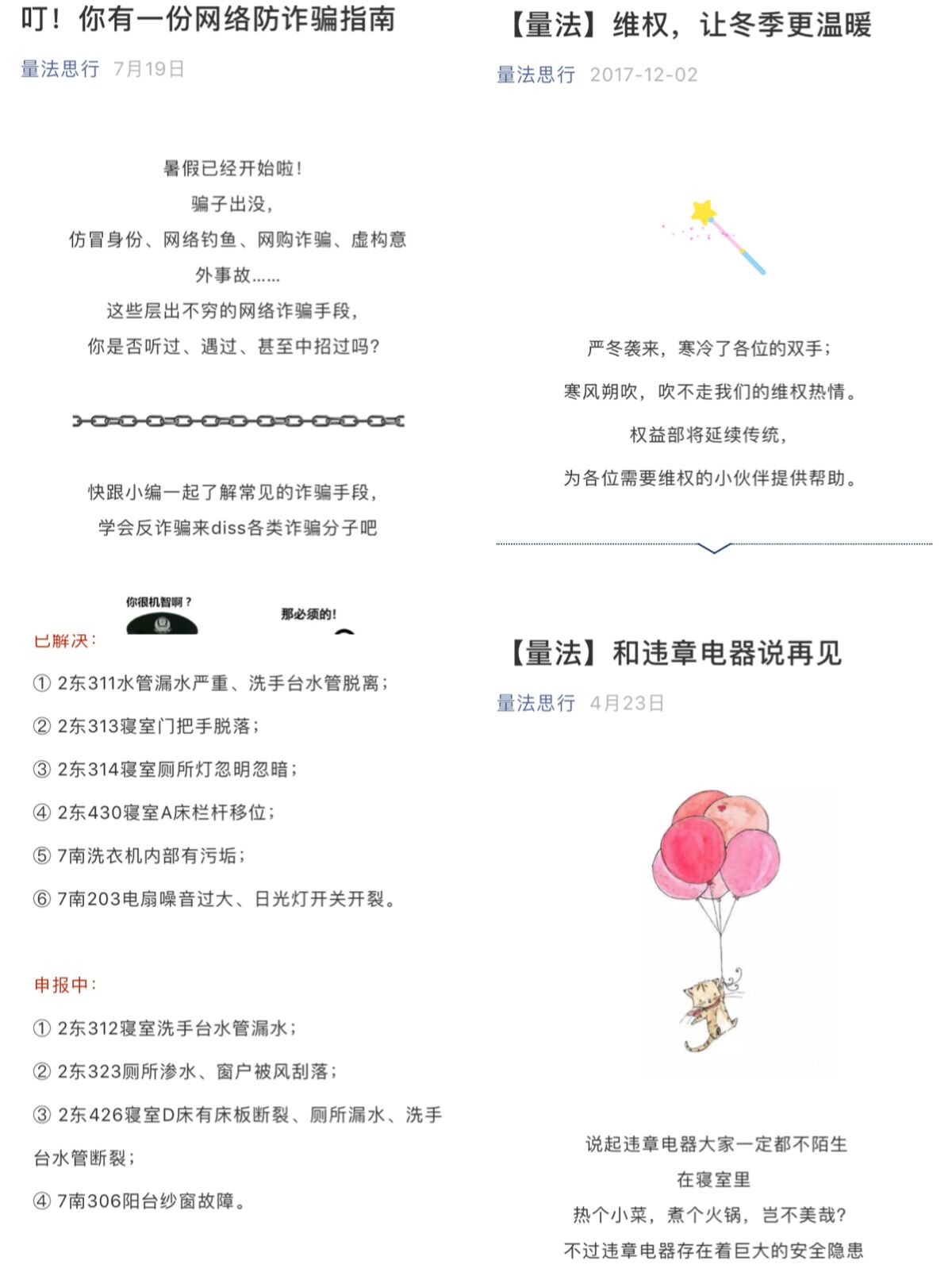 权益部日常的工作是帮助学生进行维权。借助学院微信公众号“量法思行CJLU”设置的权益窗口,学生可把日常遇到的问题和困难反馈至权益部,权益部的学生根据大家的反馈与学校相关部门进行对接,并将解决结果反馈给学生,在日常维权过程中,帮助同学们解决日常遇到的问题。并在“法律文化节”、“知识产权周”的外场活动中摆摊,给学生提供现场反馈问题的途径,之后根据同学们的疑问,进行解决,并予以答复。