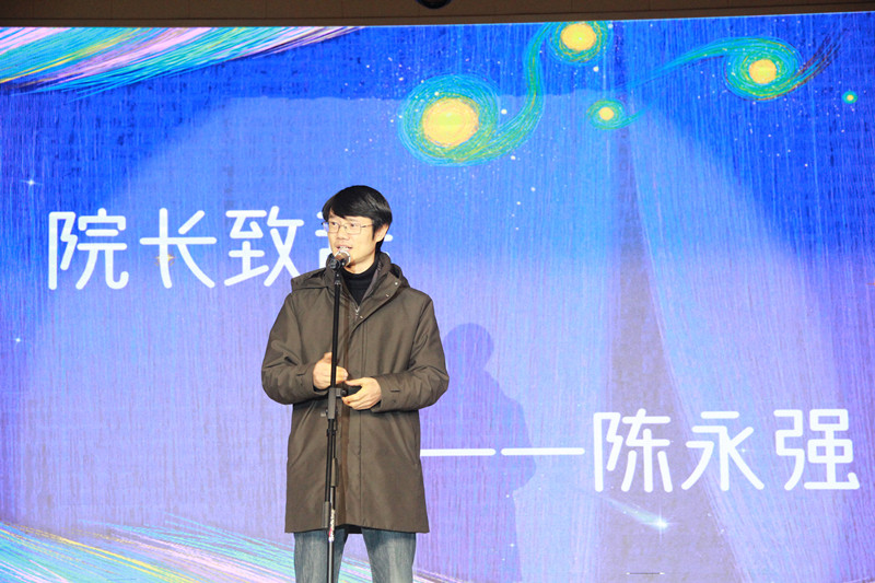 在晚会开始前,陈永强致辞,他介绍学院取得的成绩和学院的师资力量,鼓励学生珍惜大学时光,为自己的生活留下不一样的经验。同时,他希望同学们能够在大学里建立与学校学院的感情,建立同学和师生之间的友情,获得珍贵的财富。