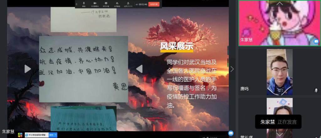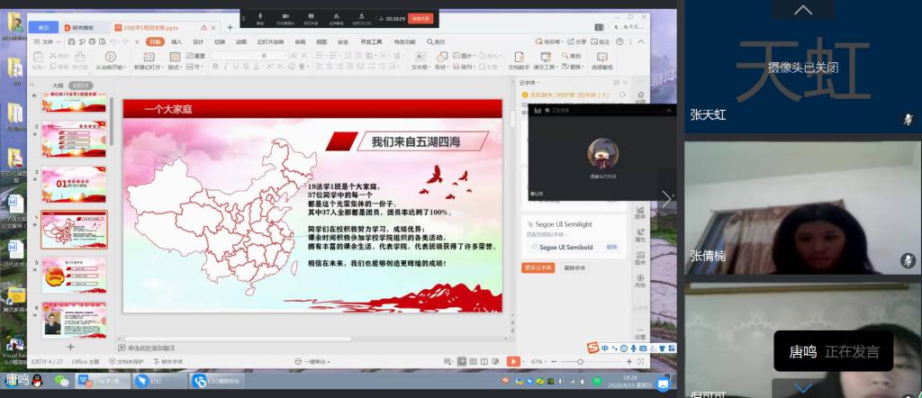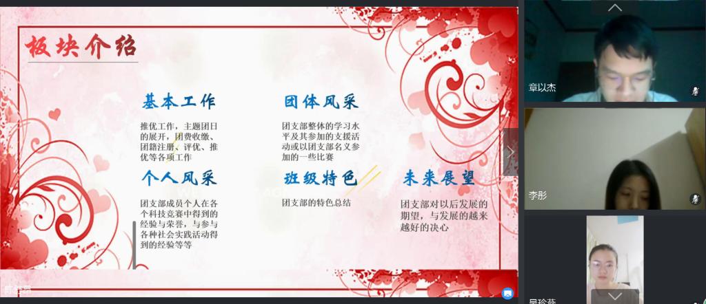 最后,陈爽进行总结。疫情时期利用网络新形式展现出来的团支部精神面貌要继续保持,到返校时也要继续发扬;希望各团支部相互学习,把好的经验和做法吸收,让团支部更有活力。法学院团委今后将继续加强基层团组织建设,发挥团支部先锋堡垒作用。