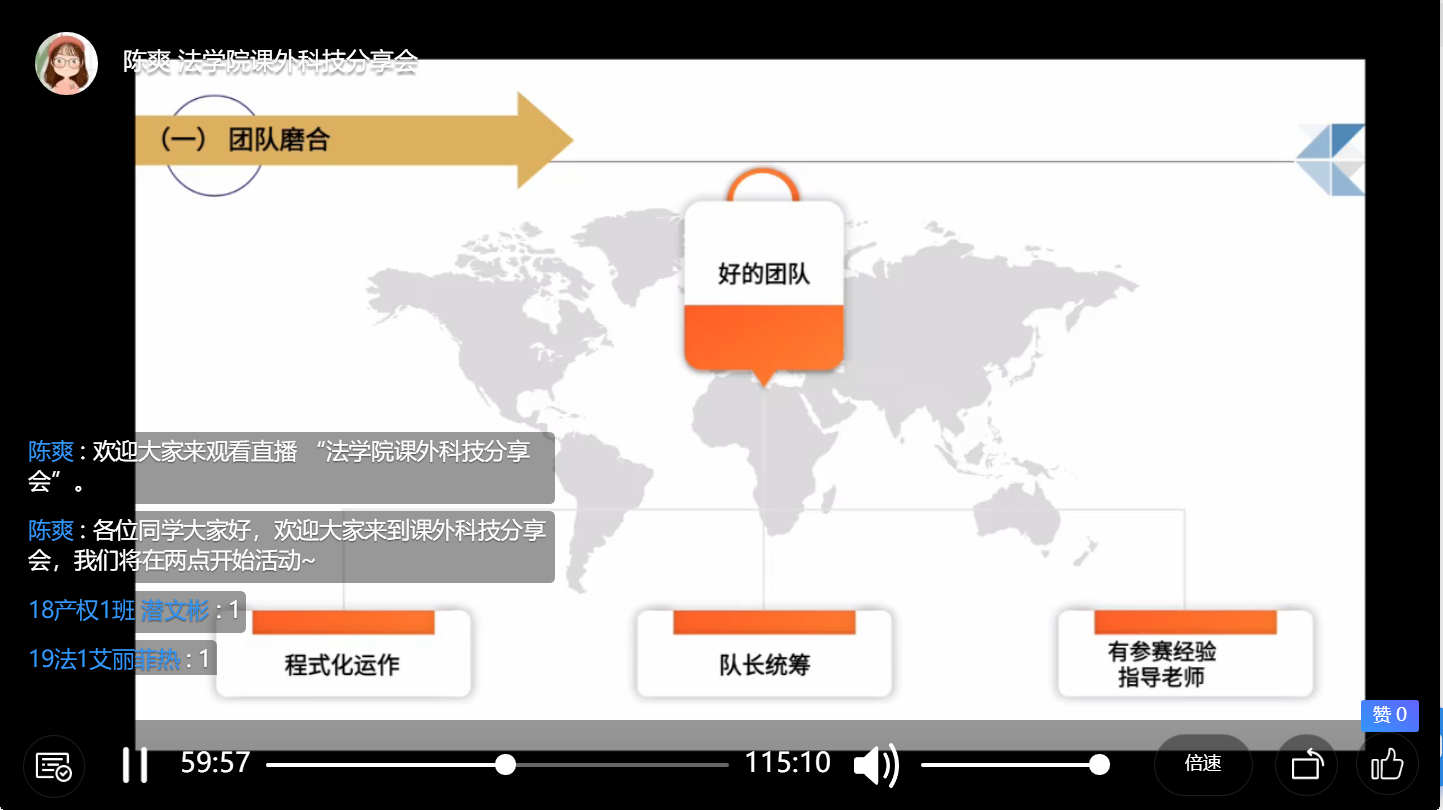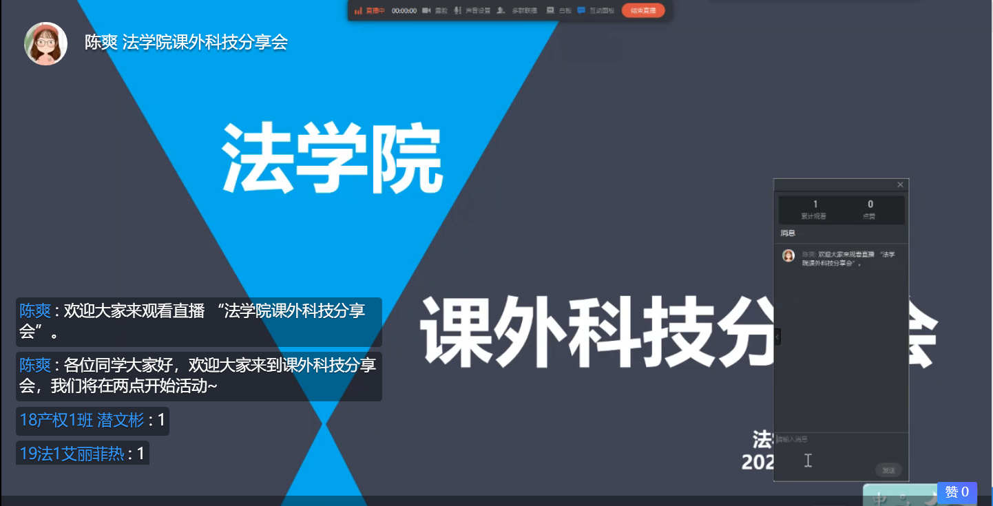 学科竞赛是拓展学生的知识面、培养学生创新思维、实践动手能力和团队协作精神的平台及载体,可以有效提高学生综合素质,丰富校园学术氛围,提高学生综合素质,培养高素质人才。为让学生更好地了解学科竞赛种类,了解学科竞赛备赛时间节点,以及为学院“挑战杯”、“法科竞赛”、“职规赛”培育参赛选手,法学院于4月15日通过钉钉直播进行“法学院2020年课外科技分享会”。此次分享会由法学院负责课外科技辅导员陈爽主持,法学院2019、2018级400余名学生参加。