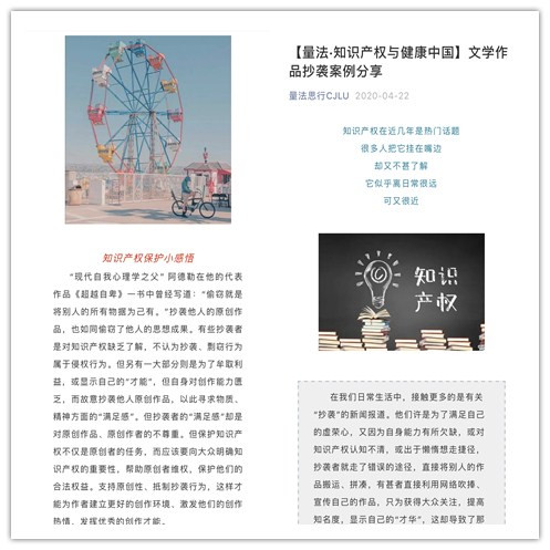 疫情还未结束,广大学生没有迎来开学返校,却迎来世界知识产权日4月26日。为使同学们对知识产权相关知识有进一步的认识和了解,增强维权意识,了解维权渠道,法学院“倾心法苑”心理工作站于我校知识产权周期间举办“文学作品抄袭案例分享”活动。此次活动以公众号推文形式,与同学们分享两个侵权案件的起因、经过和审判结果,希望同学们能够从经典案例中意识到侵权的严重后果。此外,活动还介绍《中华人民共和国著作权法》相关规定,提出深刻感悟。