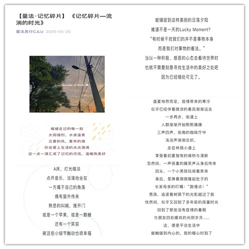 “记忆碎片——流淌的时光”。活动针对2017至2019级学生开展。同学们分享自己生活中所经历过的暖心片段,安心部选取其中11名同学的优秀投稿作品,在推送中进行分享,旨在希望大家体验藏在记忆里的小美好,更加热爱生活,发现生活的动心时刻。