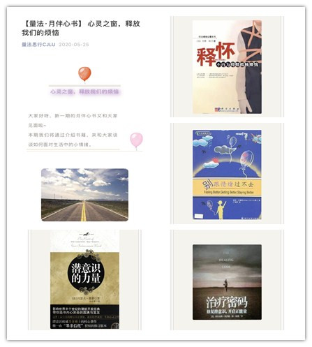 “月伴心书”。此次“月伴心书”栏目不同于以往的形式,共向同学们推荐4本关于如何面对情绪的心理书籍,分别有日本作家大野裕的《释怀:不再为抑郁孤独烦恼》、美国作家艾里斯的《别跟情绪过不去》、美国作家约瑟夫·墨菲的《潜意识的力量》以及亚历克斯·洛伊德、班·琼森的《治疗密码》。每本书都有其侧重点,为如何解决生活中出现的心理烦恼提供一些技巧和方式。希望这些书籍能够帮助有困惑的同学解决负面情绪,让他们的生活驱散乌云、直面阳光。