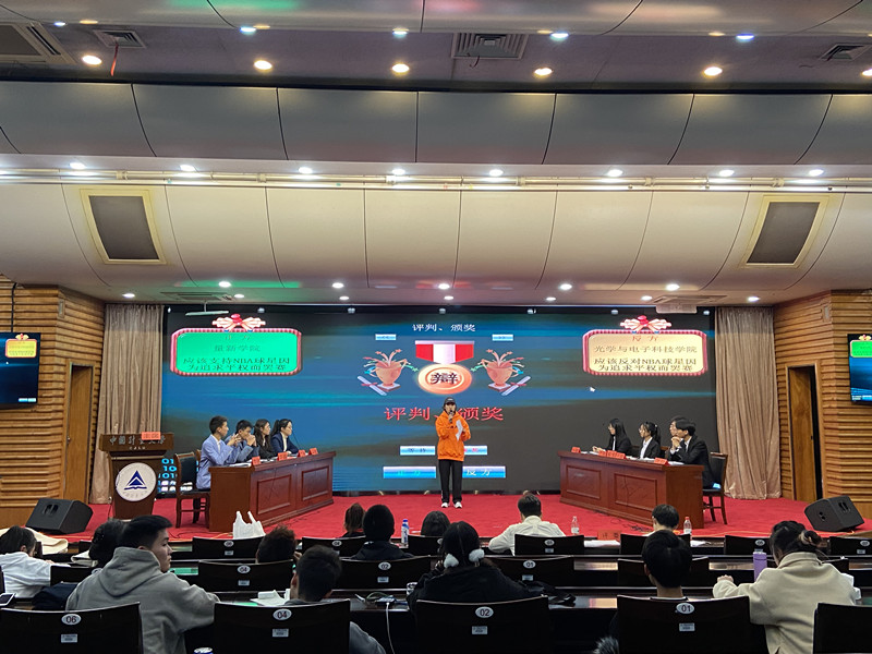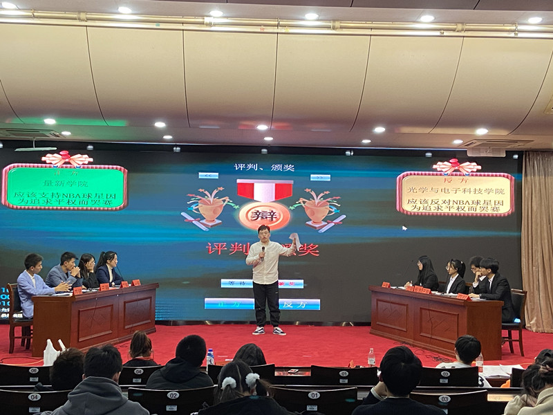 经过初赛和复赛多轮比拼,进入决赛的两支队伍分别为光学与电子科技学院代表队和量新学院代表队,两方辩手围绕“应该支持/反对NBA球星为追求平权而罢赛”的论题展开针锋相对的激烈辩论。辩论赛开始,正反双方辩手根据自己的立论展开辩论,从开篇立论到质询攻瓣,从自由辩论到总结陈词,辩论双方唇枪舌战,据理力争,思维相当敏捷,表现出整体作战的团队精神与作风。双方你来我往,互不相让,饱含激情又不失理性的阐述己方观点,同时敏锐的抓住对方的漏洞进行反驳,双方的交锋让现场的气氛变得紧张又激动人心。最终,经评委的点评和商讨后,正方量新学院代表队赢得此次辩论赛的胜利。反方四辨光学与电子科技学院张砚棋获得此次辩论赛最佳辩手称号。
