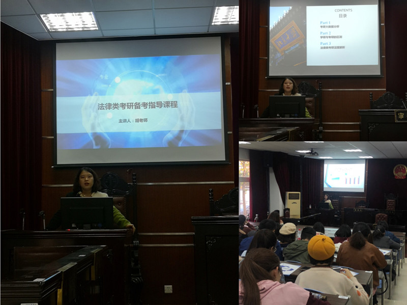为能够帮助学生了解新形势下考研动向,帮助学生梳理考研复习思路,了解法律类考研的特点,11月8日下午,法学院邀请胡晓杰老师在格致南楼124模拟法庭进行“法律类考研备考指导”专题讲座。法学院2017、2016、2015级学生参加此次讲座。