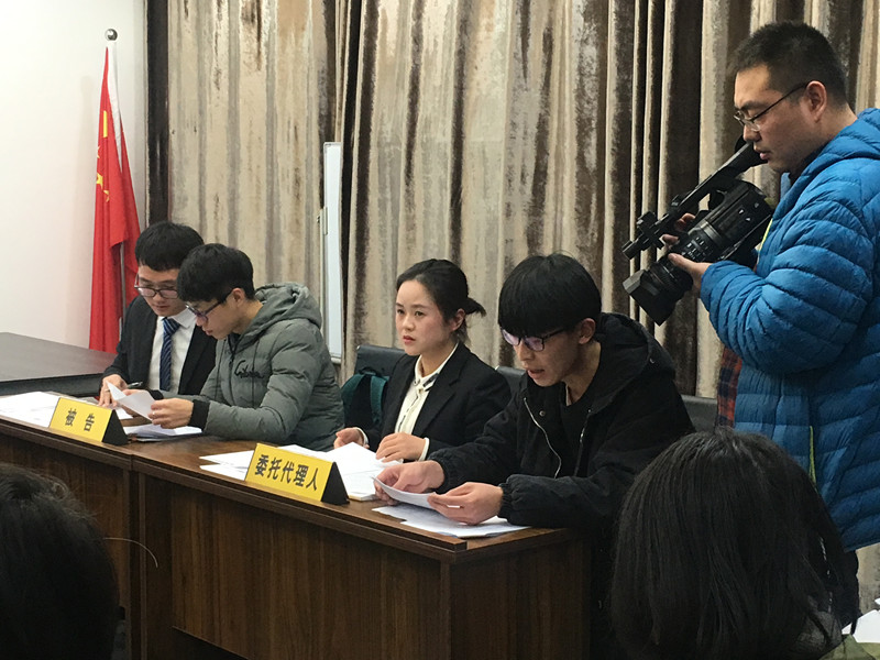 在律师事务所里,学生不仅参观律师的工作状态,更亲身体验法庭庭审的状态。下午2:00,随着一声清脆的法槌敲击声,重庆万州公交车坠江案的模拟法庭在律师事务所的会议室准时开庭。在这场模拟法庭里,不仅仅是青年律师及律师助理的职业技能和实战经验的展现,更是学生表演的舞台,由学生扮演人民陪审员和被告,让同学们感受一场真真切切“从书本走向实践”的职场体验。