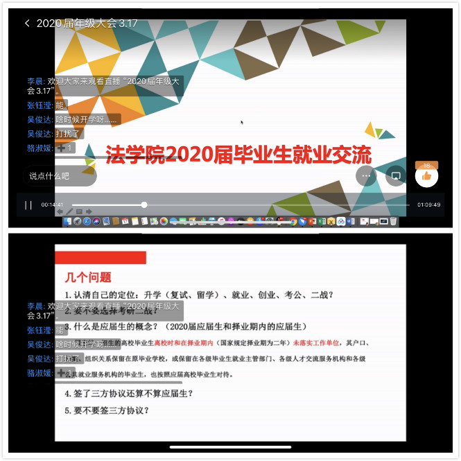 为了解毕业生动向,提高针对性帮扶,进一步做好2020届毕业生就业工作,3月17日,法学院召开2020届毕业生网上座谈会,会议由2020届就业辅导员李晨组织,全体毕业生参加。