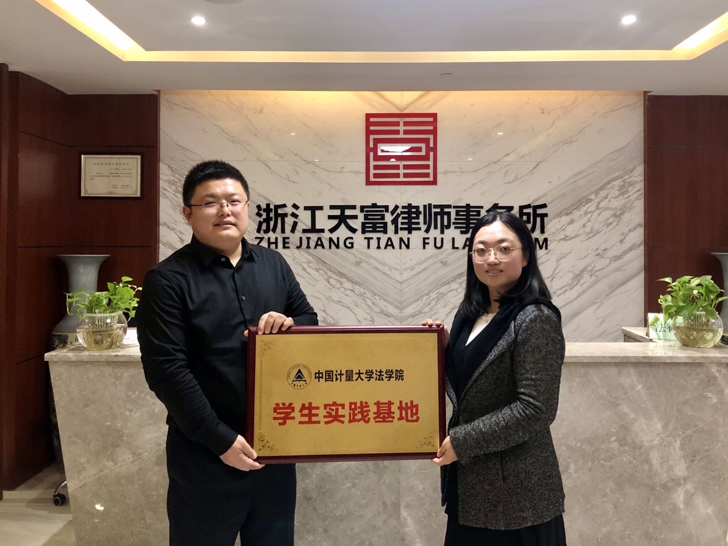 陈爽感谢浙江天富律师事务所对学院实习实践交流的支持,并介绍法学院的学科特色、人才培养模式、高校平台优势。解本平对法学院一行的来访表示欢迎,并详细介绍律所的基本情况、律师培养方案和团队建设情况,希望双方继续探索合作方式。随后,陈爽为律所授“中国计量大学法学院学生实践基地”牌。