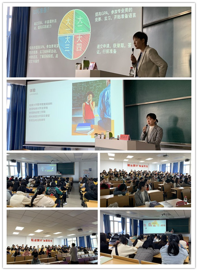 陈燕针对目前的国际形势和教育形势,结合国内学生的未来发展意愿,通过对比国内考研和海外读研,精炼且有力地说明出国学生的现状以及出国留学的优势。并针对法学专业,介绍几所世界顶尖高校的相关学制、课程开设以及入学要求。其中对国际法、经济法、知识产权法等热门专业的介绍,深深吸引同学们的兴趣。