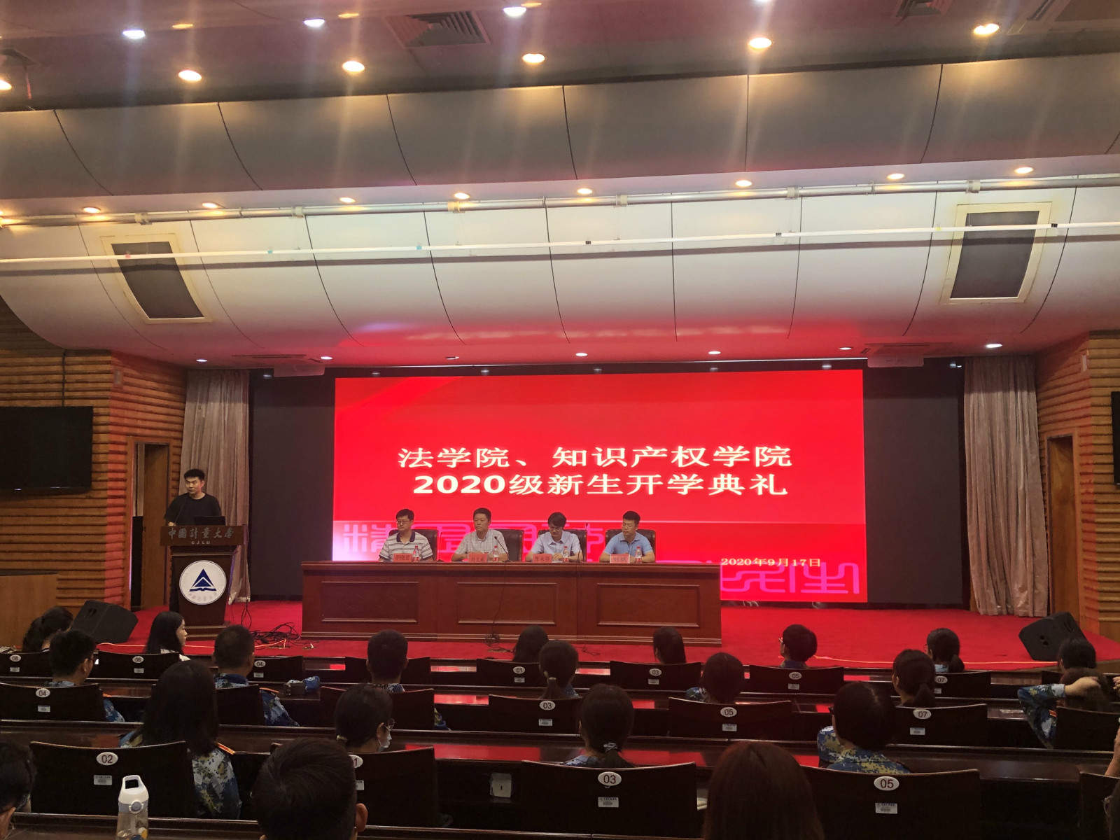 9月17日下午,法学院、知识产权学院2020级新生开学典礼在闻厅二楼报告厅举行。法学院党委书记刘文献、院长陈永强、法律系系主任李晓君、知识产权系系主任刘斌、2020级新生班主任、学工办全体老师以及285名2020级本科新生参加。会议由2020级新生辅导员李晨主持。