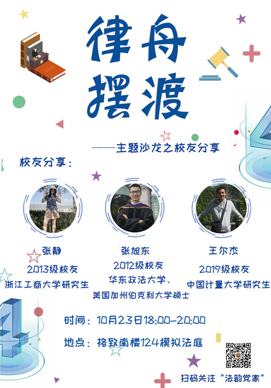 为帮助学生做好职业规划,提升就业能力,法学院于1023日在格致南楼124模拟法庭举办“量法律舟”就业系列活动之校友经验分享会。此次活动作为校友返校活动的一部分,参加活动的嘉宾有2012级校友张旭东(华东政法大学和美国加州伯克利大学双硕士),2013级校友张静(浙江工商大学硕士)以及2019级本校研究生王尔杰。分享会由2017级辅导员姚昱帆主持,各年级学生共100余人参加。