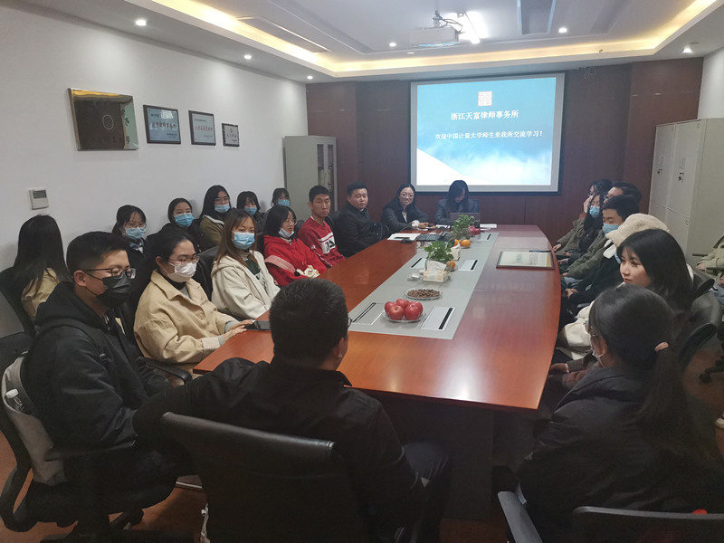 陈爽感谢浙江天富律师事务所对学院实习实践交流的支持,并介绍法学院的学科特色、人才培养模式、高校平台优势。解本平对法学院一行的来访表示欢迎,并详细介绍律所的基本情况、律师培养方案和团队建设情况,希望双方继续探索合作方式。随后,陈爽为律所授“中国计量大学法学院学生实践基地”牌。