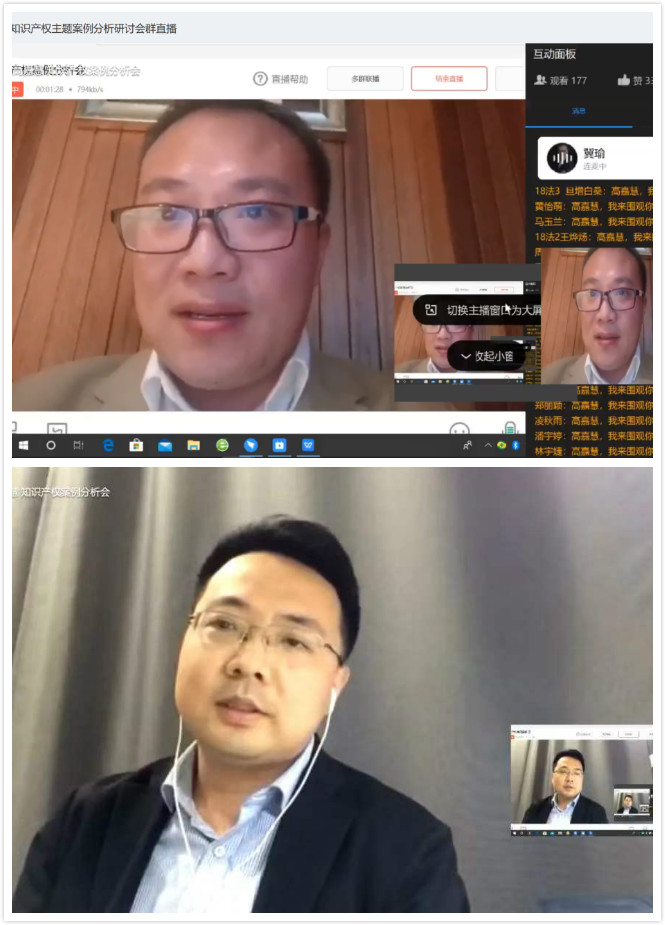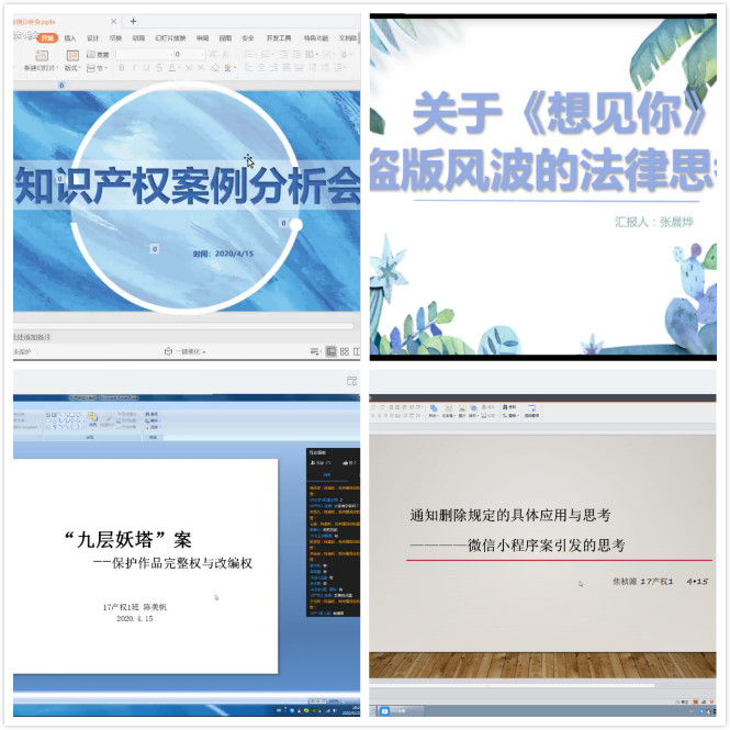 在“4.26”世界知识产权日来临之际,作为法学院知识产权周活动之一,为帮助学生更好地了解知识产权案例分析与实务操作,法学院党员之家理论学习部于4月15日举办第三期案例分析工作坊之知识产权专场。此次案例分析研讨采取线上钉钉直播方式,2017级张晨烨、陈美帆、焦桢源三名同学就当下热点《想见你》盗版风波、《九层妖塔》侵权案和微信小程序侵权案展开分析,知识产权系冀瑜、雷刚两位老师进行在线点评指导,来自大一、大二300余名学生在线参加。
