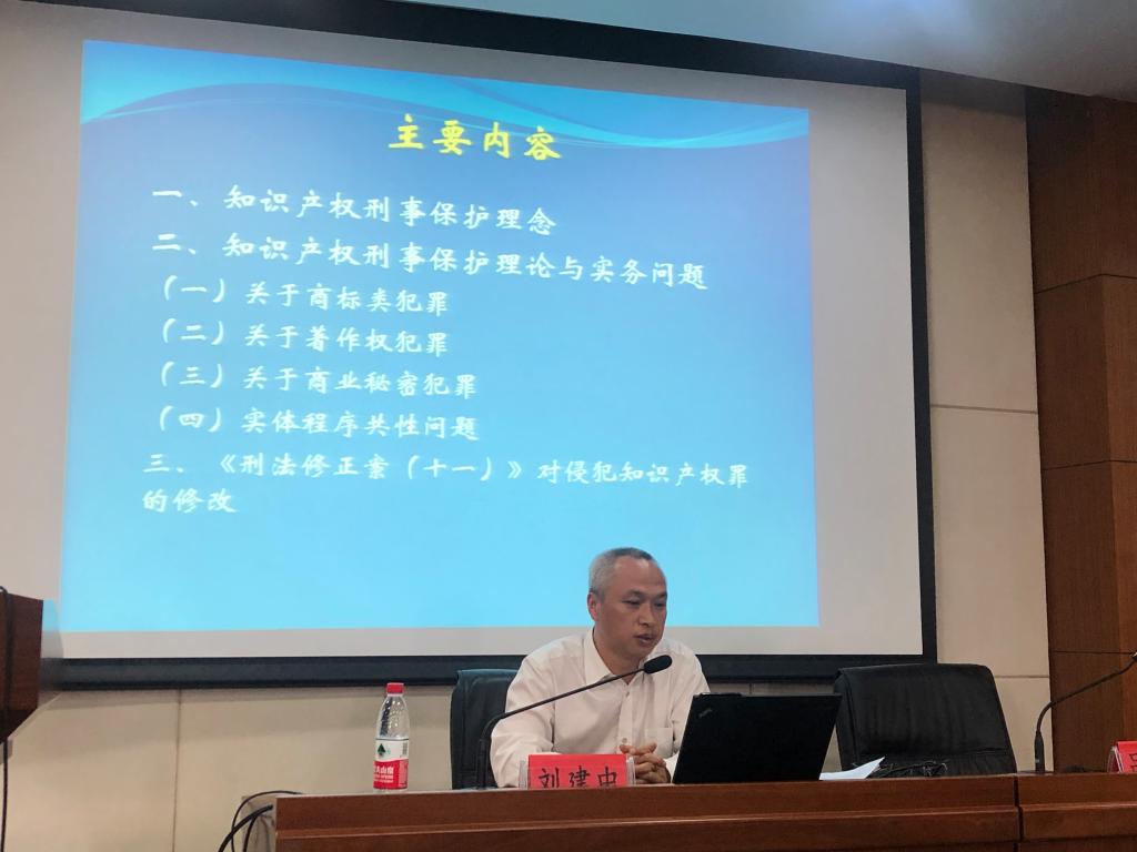 4月26日下午,浙江省高级人民法院知识产权审判庭高级法官刘建中作题为《知识产权刑事保护理论与实务》的讲座。刘建中法官长期从事经济犯罪和知识产权审判工作,并负责全省法院知识产权刑事审判具体指导工作,起草了《关于办理涉外定牌加工等刑事案件适用法律问题的会议纪要》《关于审理侵犯知识产权刑事案件若干问题的解答》《关于知识产权刑事案件适用法律若干问题的会议纪要》等多件规范性文件,办理了作为全国首例的宁波特大地沟油案和新昌毒胶囊系列案等多起有全国影响的重大案件,主审的多起案件入选全国法院十大知识产权案件和省高院指导案件。