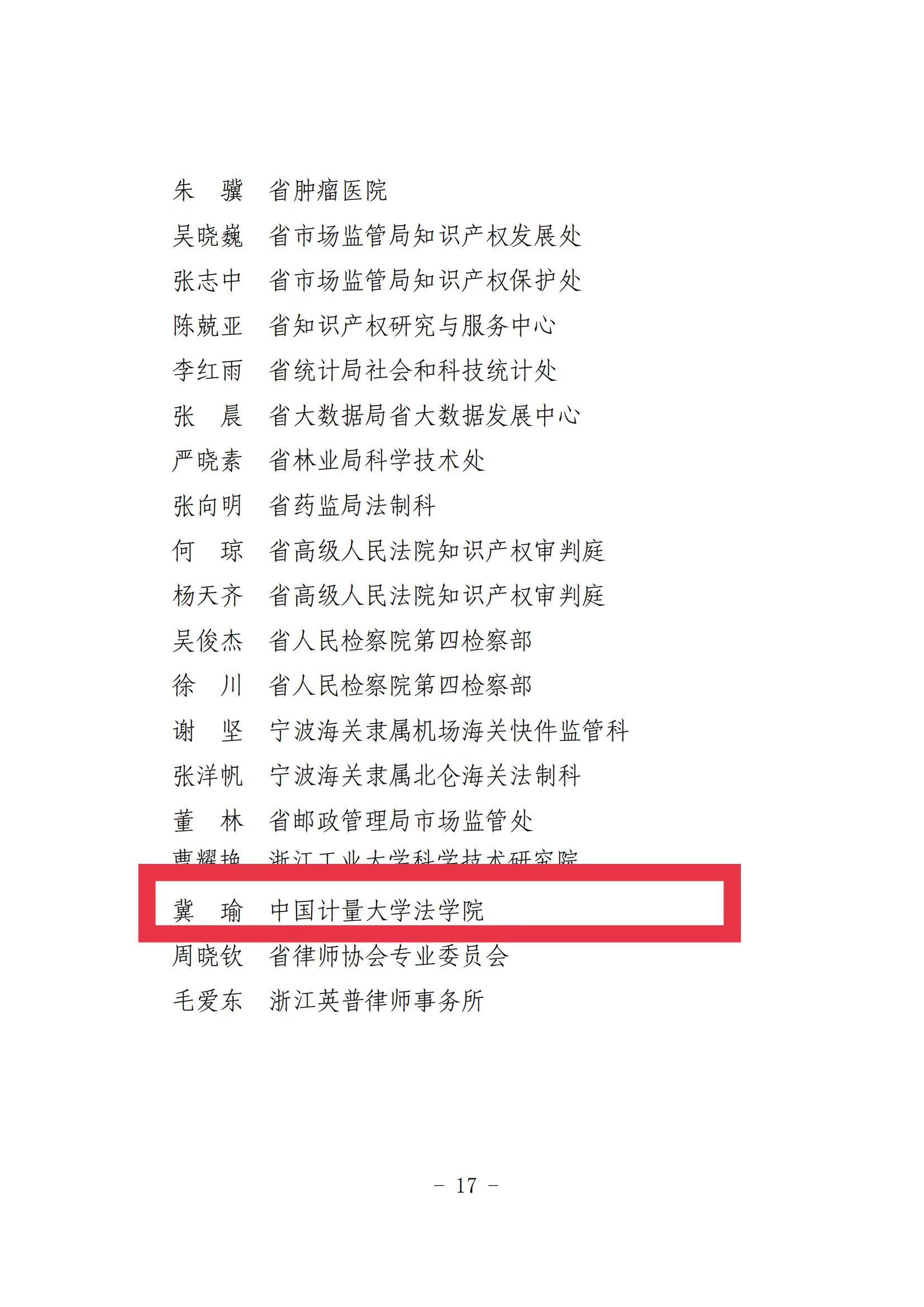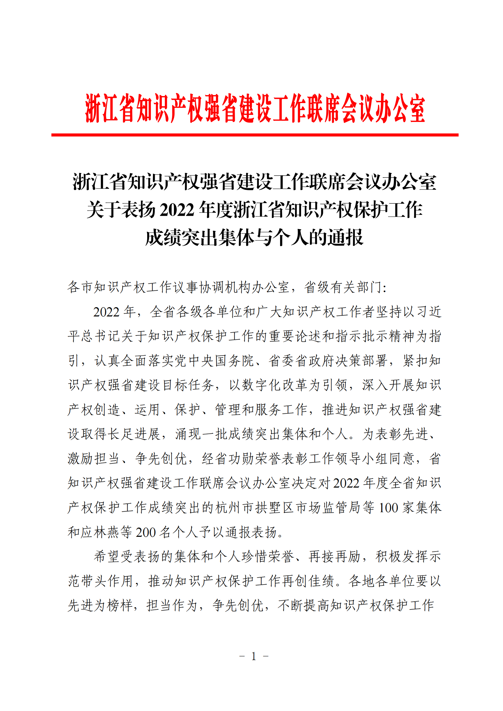 近日,为表彰先进、激励担当、争先创优,经省功勋荣誉表彰工作领导小组同意,省知识产权强省建设工作联席会议办公室对2022年度全省知识产权保护工作成绩突出的 100 家集体和200名个人予以通报表扬。我校知识产权学院获2022年浙江省知识产权保护工作成绩突出集体荣誉称号,学院副教授冀瑜获先进个人荣誉称号。